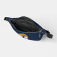 The feature on this fanny pack is a navy blue silhouette image of a golfer in full swing at the centre. The image is placed on a retro style multi colour stripe background. At the side is your custom monogram, also in blue.