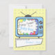 A baby shower invitation featuring an illustration of a retro blue tv with rabbit ear antennae and a test screen. Text on TV says "Stay Tuned For A Baby Boy." Text below reads "Brought To You By." Personalise with mummy's name in Blue. Background is light yellow with light green polka dots. Customise opposite side with details of your event.