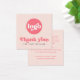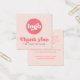 Square business thank you card featuring the text "Thank you" in a retro style font. Pink (or custom colour) text on a light blush pink background. Upload your logo on the front and add custom text on the back. You can change colours, move and resize elements with the design tool.