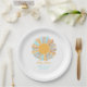 Custom paper plates. Designed with a retro boho sun in an orange yellow with light blue sunray. Browse our Bohemian Sunshine Theme for matching stationery and party goods. Napkins, invitations, thank you cards, baby shower .games and more