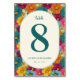 This is a whimsical style image featuring an elegant table number card surrounded by a vibrant array of colorful flowers. The large, bold teal "8" stands out against the soft cream background, while the lively floral border in shades of pink, yellow, blue, and orange adds a cheerful touch. Perfect for adding a splash of color to any wedding or event decor, this design exudes warmth and joy, making it a delightful addition to your celebration.