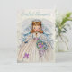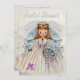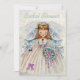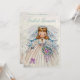 Elegant custom vintage bridal shower invitations with a cute, retro, antique illustration of a happy smiling blonde / brown hair bride from the 1940s / 1950s with a long flowing traditional, classic billowing veil, beautiful white / cream wedding gown and lovely colourful pink, purple and yellow bouquet of flowers. Her dress and bouquet have pretty lavender colour bows and she is holding a bible. The chic background has lovely white and cream colours with cute white flowers. On the reverse of these romantic, fun, girly, adorable invites is the view of the bride from the back and room for you to personalise with your text in blue. These whimsical, personalisable colourful, old fashioned, trendy, fashionable, glamourous, classy, original and unique vintage invites for bridal showers are printed / decorated on both sides / have double sided printing. All of the text can be easily customised to meet your needs and you can change the font style, colour and size of font if you desire. If you need any assistance customising your product please contact me through my store and I will be happy to help. PLEASE NOTE: All products on Zazzle have flat printed images.