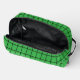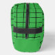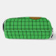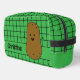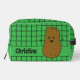 Adorable accessory bag featuring a cute happy cartoon brown potato. The background is a cute retro pattern of a black grid over a solid bold green colour. A template at the bottom and left to the potato to add your name.