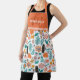 Multi coloured apron perfect for fall with a pattern of flowers, leaves, and bugs in a whimsical style. Add your name and monogram on the orange top of the apron.