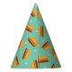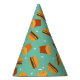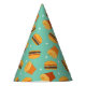 Retro style cheeseburgers and French fries pattern with small white hearts on a blue background party hat.