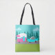 This Retro Camper / Trailer and Car All-Over Printed Tote Bag features a mid century modern, minimalist cartoon drawing that will leave you ready to take to the open road. An homage to the 1950s, this design features a vintage turquoise car with white top, pulling a kitschy travel trailer to its final destination. The perfectly restored, retro RV has a hot pink lower half, white top half, and a turquoise lightning bolt separating the two. The door in the side of the camper is also turquoise. The final accent is the hot pink wing protruding from the back of this home on wheels. The happy campers are motoring down a grey road. The roadway is surrounded by lush, green grass. In the background, we can see the teal silhouettes of a veritable forest of cedar trees, against an aqua sky with puffy, light blue clouds. This design is perfect for everyone from retired hippies, fledgling hipsters, or anyone who wants to relive some great childhood memories. The best part is that no one is asking, "Are we there yet?"