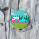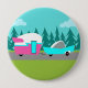 This Retro Camper / Trailer and Car Button features a mid century modern, minimalist cartoon drawing that will leave you ready to take to the open road. An homage to the 1950s, this design features a vintage turquoise car with white top, pulling a kitschy travel trailer to its final destination. The perfectly restored, retro RV has a hot pink lower half, white top half, and a turquoise lightning bolt separating the two. The door in the side of the camper is also turquoise. The final accent is the hot pink wing protruding from the back of this home on wheels. The happy campers are motoring down a grey road. The roadway is surrounded by lush, green grass. In the background, we can see the teal silhouettes of a veritable forest of cedar trees, against an aqua sky with puffy, light blue clouds. This design is perfect for everyone from retired hippies, fledgling hipsters, or anyone who wants to relive some great childhood memories. The best part is that no one is asking, "Are we there yet?"