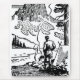 A black and white image of a man camping on a lake or river. He is standing by a campfire and tent. Image from a 1940’s Vintage Printers Book (with no copyright).