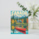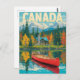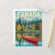 Capture the beauty of Canada with this vintage-style travel postcard featuring a cosy lakeside cabin, colourful autumn forest, snow-capped Rocky Mountains, and a classic red canoe reflected in the water.