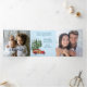 This unique retro style Holiday card showcases three of your own photographs with a fun winter time theme. The front has a vintage wood panel red truck carrying a freshly cut Christmas tree, with a snow covered forest behind it. Your custom text is in red at the bottom. The inside of the trifold card has two templates for your custom photographs, and a middle section with your custom text. The middle also has a second image of the same car. The back has another photo template, and a wreath with your monogram and text. All the text is easily customised.