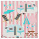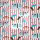 A super cute pattern with a camping theme featuring retro caravans, tents, deck chairs, sun umbrellas and picnic tables in tones of turquoise blue, pink and white,