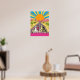 Poster in an illustration of five stylishly dressed cats wearing sunglasses ride in a pink convertible through a vibrant desert landscape. The backdrop features cacti, mountains, and a radiant, setting sun. The whimsical, pop-art style evokes a playful, retro road trip vibe.