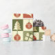 Retro inspired Christmas pattern featuring playful reindeer, snowflakes, ornaments, Christmas trees, and gift boxes arranged in a checkered layout. Classic colour palette of red, green, and cream holiday wrapping paper.
