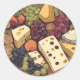 Classic Round Sticker with a retro graphic picture of a cheese plate with walnuts and grapes on it. Excellent for anyone or any business involved with gourmet food, catering, or fruit.