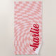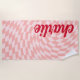Beach towel featuring a light blush pink, twisted chequerboard pattern and your name in a red, retro style font.