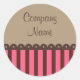 Candy coloured stripes and chocolate scallops give this business sticker retro style. Use these stickers for packaging, as envelope seals, etc....Use these pink and brown stickers for a bakery, boutique, shop, business, etc...Customise these stickers to suit your needs by changing the company name. The designs are from original art.