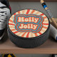 Retro Christmas Holidays Holly Jolly Typography Hockey Puck features a festive retro script "Holly Jolly" in modern typography accented on a sun ray background. Perfect for Christmas gifts and favours. Designed by © Evco Holidays www.zazzle.com/store/evcoholidays