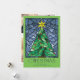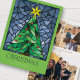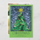 These bright and colourful 5" x 7" flat Christmas greeting cards feature a handmade watercolor stained glass window design of a green Christmas tree with a gold star and red ornaments framed in shades of blue on a parrot green background. The greeting is "Christmas," in large decorative letters with an editable greeting, "Wishing you peace, love and joy this holiday season."