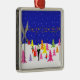 This Retro Christmas Tree Farm Holiday Ornament features a mid century modern, minimalist, cartoon family in search of the perfect tree for trimming. The design shows Mum, Dad and Junior in a colourful, 1960s style, Christmas tree lot that looks like it belongs in a televised holiday special. They were beckoned there by the glowing, yellow spotlights illuminating the evening sky and the strands of colourful Christmas lights, which are strung from pole to pole. The snow covered lot offers trees of the cartoon variety. Don't expect to find a blue spruce here. But, if the family is wanting a pink, purple, yellow, orange or red tree, they are in luck! Hey, there are even a couple of green cedars, if they choose to go a more traditional route. The snow is continuing to fall on the merry family decked out in their holiday attire. Junior is wearing blue dungarees and a shirt that is redder than a certain reindeer's nose. Dad is wearing a black suit with a bright green tie. But it is Mum who puts the jolly is this family's wardrobe. She is wearing a red dress with green trim and a matching Santa hat. Mum and Dad are still conferring, unaware that Junior is making a mad dash to the hot pink tree of his dreams. Check every side, Junior! It wouldn't do to purchase a tree with bald spots. Wouldn't you just know it? The tree is as perfect as this design. In fact, if this design were any more perfect, you would hear a choir of children singing in the background.