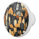This unique ceramic knob features a retro pattern of city skyscrapers and trees in tan, rust and grey on a black background.