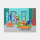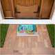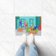 This Retro Classic Television Door Mat takes you back to a simpler time. The 1960's style, minimalist, cartoon drawing will have you looking for the opening credits. The design shows a mid century modern, sunken, living room with teal and turquoise walls and a red, cone shaped fireplace, complete with a roaring fire. All eyes are on the lanky, man of the house as he makes his grand entrance. The handsome Mister is wearing a blue suit and orange tie. His lovely Mrs. and energetic, young son are rushing to greet him. The lady of the house is wearing a hot pink, sheath dress, which she fills out in all the right places. The flip in her dark hair is sheer perfection. Junior is wearing a red shirt and blue jeans for his dash to see if his father has brought him anything. Whoa! Don't knock over the potted plant, Junior! On the lower level, we can see a green couch and an orange coffee table. Wait! We appear to have guests! Seated on the couch are a dark haired man in a blue suit and red tie, alongside a shapely blonde woman in a red dress with a red bow in her hair. Hey! It's Dad's coworkers. How did they get there first? It's one of the eternal mysteries of television. It looks like we're all set for a great evening in sitcom suburbia. But, first, we have to see if Dad is going to trip over the orange ottoman or sidestep it with some fancy footwork. Oh, the zaniness! The only thing missing from this scene is the theme song. And, if you listen closely, you can probably hear it in your mind.