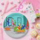 This Retro Classic Television Paper Plate takes you back to a simpler time. The 1960's style, minimalist, cartoon drawing will have you looking for the opening credits. The design shows a mid century modern, sunken, living room with teal and turquoise walls and a red, cone shaped fireplace, complete with a roaring fire. All eyes are on the lanky, man of the house as he makes his grand entrance. The handsome Mister is wearing a blue suit and orange tie. His lovely Mrs. and energetic, young son are rushing to greet him. The lady of the house is wearing a hot pink, sheath dress, which she fills out in all the right places. The flip in her dark hair is sheer perfection. Junior is wearing a red shirt and blue jeans for his dash to see if his father has brought him anything. Whoa! Don't knock over the potted plant, Junior! On the lower level, we can see a green couch and an orange coffee table. Wait! We appear to have guests! Seated on the couch are a dark haired man in a blue suit and red tie, alongside a shapely blonde woman in a red dress with a red bow in her hair. Hey! It's Dad's coworkers. How did they get there first? It's one of the eternal mysteries of television. It looks like we're all set for a great evening in sitcom suburbia. But, first, we have to see if Dad is going to trip over the orange ottoman or sidestep it with some fancy footwork. Oh, the zaniness! The only thing missing from this scene is the theme song. And, if you listen closely, you can probably hear it in your mind.