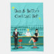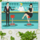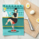 Every hour is happy hour with this Customisable Retro Cocktail Lounge Kitchen Towel. The mid century modern design features a vibrant, 1960's style, minimalist, cartoon drawing of a classy, cocktail bar. Against the backdrop of an aqua wall, we can see rows of drink glasses. At least we can see the teal silhouettes of drink glasses. Judging from the shapes of the stemware, this bar is well equipped to wet your whistle, whatever your drink preference. A most competent and personable bartender is manning the teal bar with yellow accents. The young barkeep is wearing a pristine, white shirt with black bow tie. His fresh-faced good looks, blonde hair and black hipster glasses give us every reason to believe that he either spends his days as a struggling actor or a superhero. In one hand, the handsome mixologist is handing a martini to a customer on the opposite side of the bar. The waiting customer is a broad-shouldered gentleman in a black suit and red tie. He's the sort of fellow who is described as tall, dark, and handsome even when it's still hours until closing time. There seems to be a red and chrome bar stool with Mr. Debonair's name on it. Yet, not to be presumptuous, he asks the question, "Pardon me. Is this seat taken?" He is asking the raven haired gal on the neighbouring bar stool. She's a real "girl next door" type, if you happen to live next door to a flawless beauty with a figure that won't quit. She is wearing a black dress and holding a martini in one hand. She's hoping that she and the approaching gentleman have more in common that their drink preference and choice of wardrobe colour. It looks like this evening just got interesting. Cheers to you! Personalise to make an adorable accessory for your wet bar.