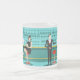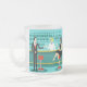 Every hour is happy hour with this Retro Cocktail Lounge Mug. The mid century modern design features a vibrant, 1960's style, minimalist, cartoon drawing of a classy, cocktail bar. Against the backdrop of an aqua wall, we can see rows of drink glasses. At least we can see the teal silhouettes of drink glasses. Judging from the shapes of the stemware, this bar is well equipped to wet your whistle, whatever your drink preference. A most competent and personable bartender is manning the teal bar with yellow accents. The young barkeep is wearing a pristine, white shirt with black bow tie. His fresh-faced good looks, blonde hair and black hipster glasses give us every reason to believe that he either spends his days as a struggling actor or a superhero. In one hand, the handsome mixologist is handing a martini to a customer on the opposite side of the bar. The waiting customer is a broad-shouldered gentleman in a black suit and red tie. He's the sort of fellow who is described as tall, dark, and handsome even when it's still hours until closing time. There seems to be a red and chrome bar stool with Mr. Debonair's name on it. Yet, not to be presumptuous, he asks the question, "Pardon me. Is this seat taken?" He is asking the raven haired gal on the neighbouring bar stool. She's a real "girl next door" type, if you happen to live next door to a flawless beauty with a figure that won't quit. She is wearing a black dress and holding a martini in one hand. She's hoping that she and the approaching gentleman have more in common that their drink preference and choice of wardrobe colour. It looks like this evening just got interesting. Cheers to you!