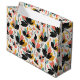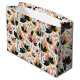 A Large Gift Bag Designed In Retro Colors Of Black, Teal, Gold And Orange Shaped In A Floral Leaf Design