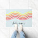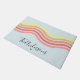 Greet friends and family to your house with this vibrant and eye-catching personalised Retro Colourful Blue Groovy Lines Beach Sunrise Doormat, featuring abstract wavy lines in a colour palette inspired by a beautiful sunrise. Perfect for a beach house, vacation rental, seaside cottage or a wonderful housewarming gift.