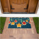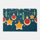 A festive retro Christmas scene with red, green, and gold ornaments hanging from sparkling, beaded garlands, on a snowy royal blue background with light blue pine trees. Be creative this year with your Christmas home decor, and dress up your home entrance with this delightfully different and festive doormat. Perfect if you're a vintage design fan. Visitors will love this design!