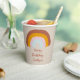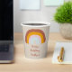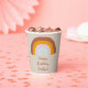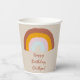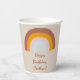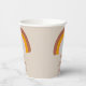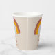 Create custom party supplies with retro vibes. These paper cups feature a doodle style illustration of a rainbow in warm colours of rust red, golden orange, pale pink and light blue set against a tan background. It's ready to be personalised with your own message in rust coloured script lettering.
