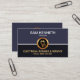 A columnar design with the upper dark blue layer against the black piece below Both layers are demarcated by a white line across the face of the card ; This is accentuated by a gold power plug creation at the centre. Over at the top you have your prestigious name and job title. Towards the base lies your slogan option and the contact number.