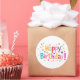 This design features a "Happy Birthday!" greeting in a fun, nostalgic style using a variety of bright colours. The lettering is surrounded by a playful scattering of colourful dots and stars that give it a classic, old-school party look. The bright teal, pink, orange, and purple shapes stand out clearly against the plain white background. It has a simple, festive feel that reminds you of childhood celebrations and tossed confetti. These circular labels are a quick way to add a pop of colour and a cheerful message to any card or gift bag.