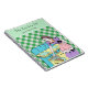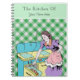 This design features the words "The Kitchen Of" at the top and on the spine, which can be personalised. Your name will go right below. If you're into the retro 1950s vintage style and love to do some cooking and baking, then this design is for you. If you're not in the kitchen too often, you can still use this design for whatever you would like. All the text can be customised. This design features a colourful 50's housewife in a retro kitchen on a green and white buffalo plaid, checks background with softer green areas for your custom text. A retro woman, is in her kitchen, leaning over her oven. She has dark brown hair, purple eyeshadow, and pink blush on her cheeks. Her dress is a pretty shade of purple with black polka dots, an orange collar, and a pink apron tied around her waist. This retro wife is hard at work in her 50's styled kitchen, with one hand on her hip, leaning over her stove. The stove has a vintage look, with bright turquoise blue, buttercup yellow, orange, and yellow-green trim.