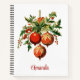 Spiral notebook with a vintage style illustration. 3 red Christmas baubles surrounded by green holly and berries. Stylish retro design.