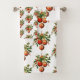 Patterned towel set with a vintage style illustration. 3 red Christmas baubles surrounded by green holly and berries. Stylish retro design.