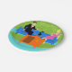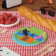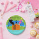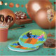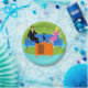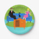 These Retro Couple with Cat Paper Plates feature a cartoon couple trying to get cosy while watching television on a mid century modern, blue sofa. The cat, however, has other ideas. On one side of the sofa, there is a handsome man in a black suit with red tie. On the other side of the stylish couch, there is a beautiful, blonde woman in a form fitting, hot pink dress. Things would be going great if it weren't for the sleek black cat, which has laid claim to the centre sofa cushion. This 1960's style, minimalist art design is set in a stylish living room. The sofa's backdrop is a green, stone wall. On the aqua floor, there is a round, green shag rug, which matches the stone wall. At the forefront of the design, we see the back of an orange television set with rabbit ears, which seems to be playing the cat's favourite TV program.