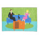 This Retro Couple with Cat Pillowcase features a cartoon couple trying to get cosy while watching television on a mid century modern, blue sofa. The cat, however, has other ideas. On one side of the sofa, there is a handsome man in a black suit with red tie. On the other side of the stylish couch, there is a beautiful, blonde woman in a form fitting, hot pink dress. Things would be going great if it weren't for the sleek black cat, which has laid claim to the centre sofa cushion. This 1960's style, minimalist art design is set in a stylish living room. The sofa's backdrop is a green, stone wall. On the aqua floor, there is a round, green shag rug, which matches the stone wall. At the forefront of the design, we see the back of an orange television set with rabbit ears, which seems to be playing the cat's favourite TV program.