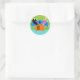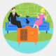 These Retro Couple with Cat Stickers feature a cartoon couple trying to get cosy while watching television on a mid century modern, blue sofa. The cat, however, has other ideas. On one side of the sofa, there is a handsome man in a black suit with red tie. On the other side of the stylish couch, there is a beautiful, blonde woman in a form fitting, hot pink dress. Things would be going great if it weren't for the sleek black cat, which has laid claim to the centre sofa cushion. This 1960's style, minimalist art design is set in a stylish living room. The sofa's backdrop is a green, stone wall. On the aqua floor, there is a round, green shag rug, which matches the stone wall. At the forefront of the design, we see the back of an orange television set with rabbit ears, which seems to be playing the cat's favourite TV program.
