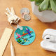 This Retro Couple with Dog Button Keychain looks like a scene out of a romantic comedy. The 1960s's style, minimalist art design features an attractive couple enjoying a romantic evening at home. The sophisticated room prominently features an aqua and teal brick fireplace with a bright red ledge. A beautiful, redhead woman wearing a bright, pink dress is perched on the ledge. She is enjoying a martini with a floating olive, a roaring fire, good music, and the company a tall, dark and handsome man. The man is wearing a blue suit and red tie. His martini glass is raised to toast his charming companion. In his other hand, he is holding a vinyl record album. At his feet, we see a most adorable dachshund wearing a red collar. The playful wiener dog is walking in the direction of a green record player with orange, spindle legs. On the floor, there is a colourful group of fun, eclectic, vinyl records. Cheers! Here's to the perfect evening at home.