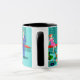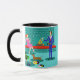 This Retro Couple with Dog Mug looks like a scene out of a romantic comedy. The 1960s's style, minimalist art design features an attractive couple enjoying a romantic evening at home. The sophisticated room prominently features an aqua and teal brick fireplace with a bright red ledge. A beautiful, redhead woman wearing a bright, pink dress is perched on the ledge. She is enjoying a martini with a floating olive, a roaring fire, good music, and the company a tall, dark and handsome man. The man is wearing a blue suit and red tie. His martini glass is raised to toast his charming companion. In his other hand, he is holding a vinyl record album. At his feet, we see a most adorable dachshund wearing a red collar. The playful wiener dog is walking in the direction of a green record player with orange, spindle legs. On the floor, there is a colourful group of fun, eclectic, vinyl records. Cheers! Here's to the perfect evening at home.