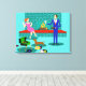 This Retro Couple with Dog Stretched Canvas Print looks like a scene out of a romantic comedy. The 1960s's style, minimalist art design features an attractive couple enjoying a romantic evening at home. The sophisticated room prominently features an aqua and teal brick fireplace with a bright red ledge. A beautiful, redhead woman wearing a bright, pink dress is perched on the ledge. She is enjoying a martini with a floating olive, a roaring fire, good music, and the company a tall, dark and handsome man. The man is wearing a blue suit and red tie. His martini glass is raised to toast his charming companion. In his other hand, he is holding a vinyl record album. At his feet, we see a most adorable dachshund wearing a red collar. The playful wiener dog is walking in the direction of a green record player with orange, spindle legs. On the floor, there is a colourful group of fun, eclectic, vinyl records. Cheers! Here's to the perfect evening at home.