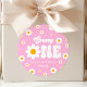 This is a Pink Retro Daisy Flower Groovy One 1st First Birthday Party Favour Stickers.