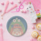 Celebrate her graduation ceremony with these cool retro daisy graduate personalised paper plates with simple rainbow arch in blue green and pink with cute simple daisy design. Modern retro typography and easy to use templates. This personalised hat with class of 2023 and the graduates name sets the seen for a cool groovy grad celebration. Original artwork by artist Catherine Sweetman