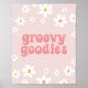 Retro inspired daisy and pink birthday party Groovy Goodies food sign with 70's style daisies and boho fonts and colours.