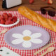 Retro inspired first birthday plates with 70's style daisies and boho fonts and colours.
