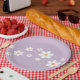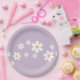 Retro inspired baby shower plates with 70s style daisies and boho colours.