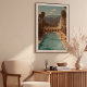 Transport yourself to a bygone era of glamourous relaxation with this stunning image capturing the essence of a retro Palm Springs resort. Bathed in warm, golden light, a sparkling turquoise pool is the centerpiece, surrounded by lush palm trees and majestic mountain vistas. People are scattered around, some lounging on chairs under striped umbrellas, others enjoying a swim, all exuding an atmosphere of carefree leisure. The photograph possesses a distinctive vintage aesthetic, with a slightly grainy texture and a warm, muted colour palette reminiscent of mid-20th century photography. This artwork evokes feelings of nostalgia, vacation vibes, and the iconic mid-century modern style associated with desert getaways. Perfect for adding a touch of sophisticated vintage charm to any space.
