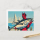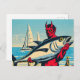 AI generated art of a red devil in a retro style of art holding up a giant tuna fish on the beach with sailboats in the background
